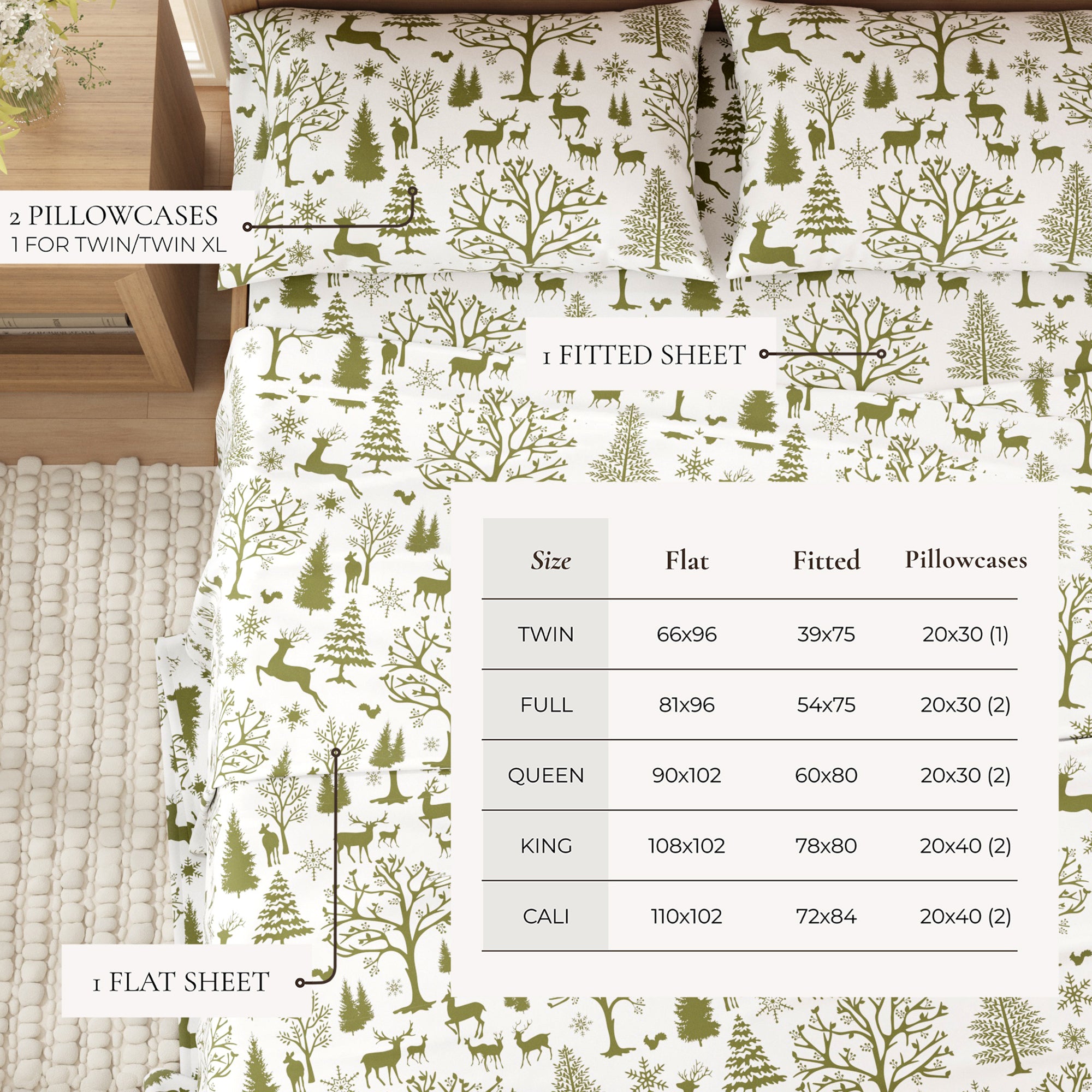 Embrace the rustic charm of the outdoors with these 100% Turkish cotton flannel sheets, perfect for bringing a cozy lodge aesthetic to your bedroom. This collection features an array of outdoorsy lodge prints that capture the essence of nature, making them your go-to choice for fall and winter bedding. These sheets are soft and warm, providing comfort during the coldest nights. They are ideal for busy families as the cotton makes them naturally durable, soft, and easy to care for - lasting many washes.