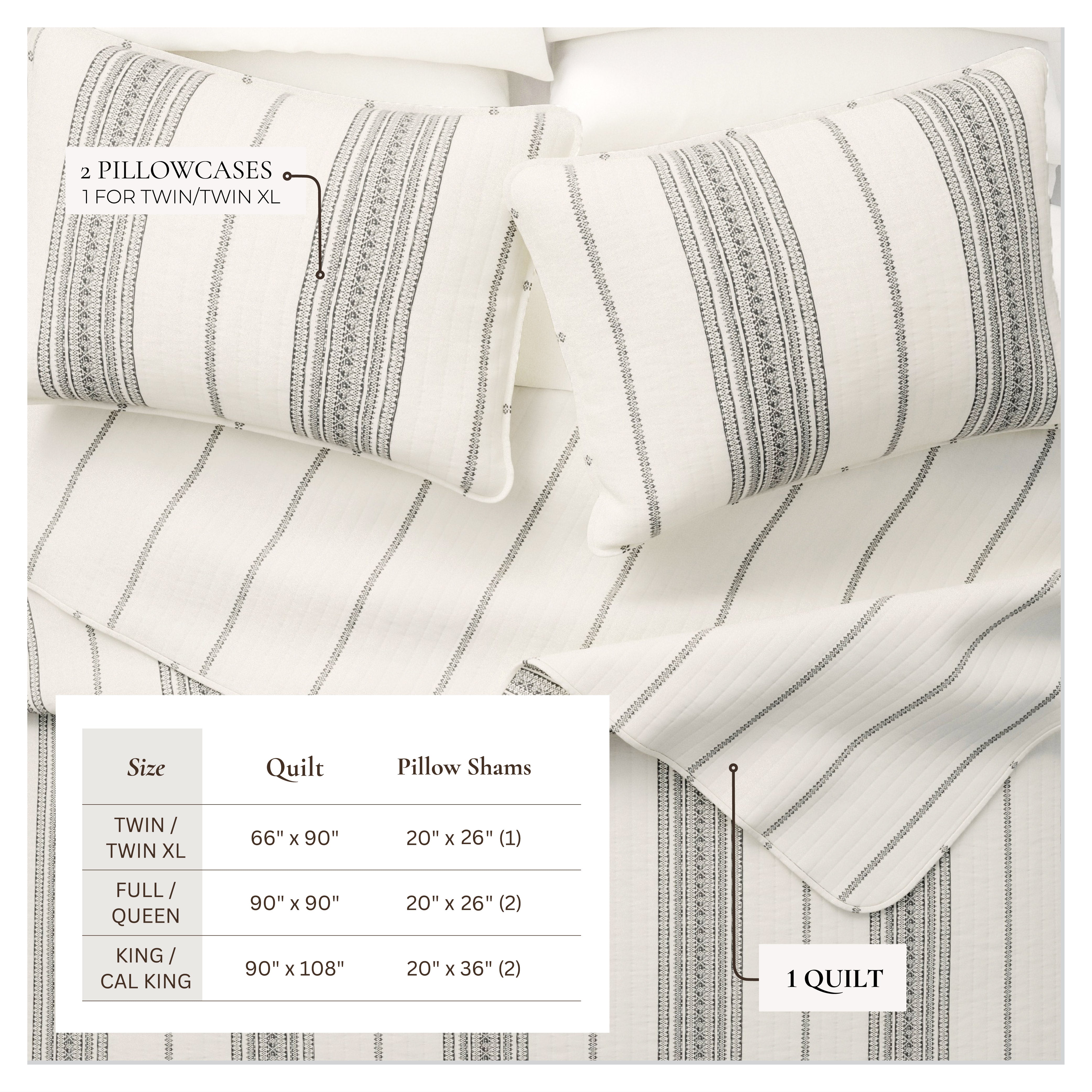 This quilt set is unique in that it can fit in with any decor style! The varied striped designs create visual interest in your bedding while still being versatile with any decor. The lightweight warmth and simplistic styling make this quilt perfect for every season. Looking to switch out the design? Simply flip the quilt to reveal its simple reverse side.